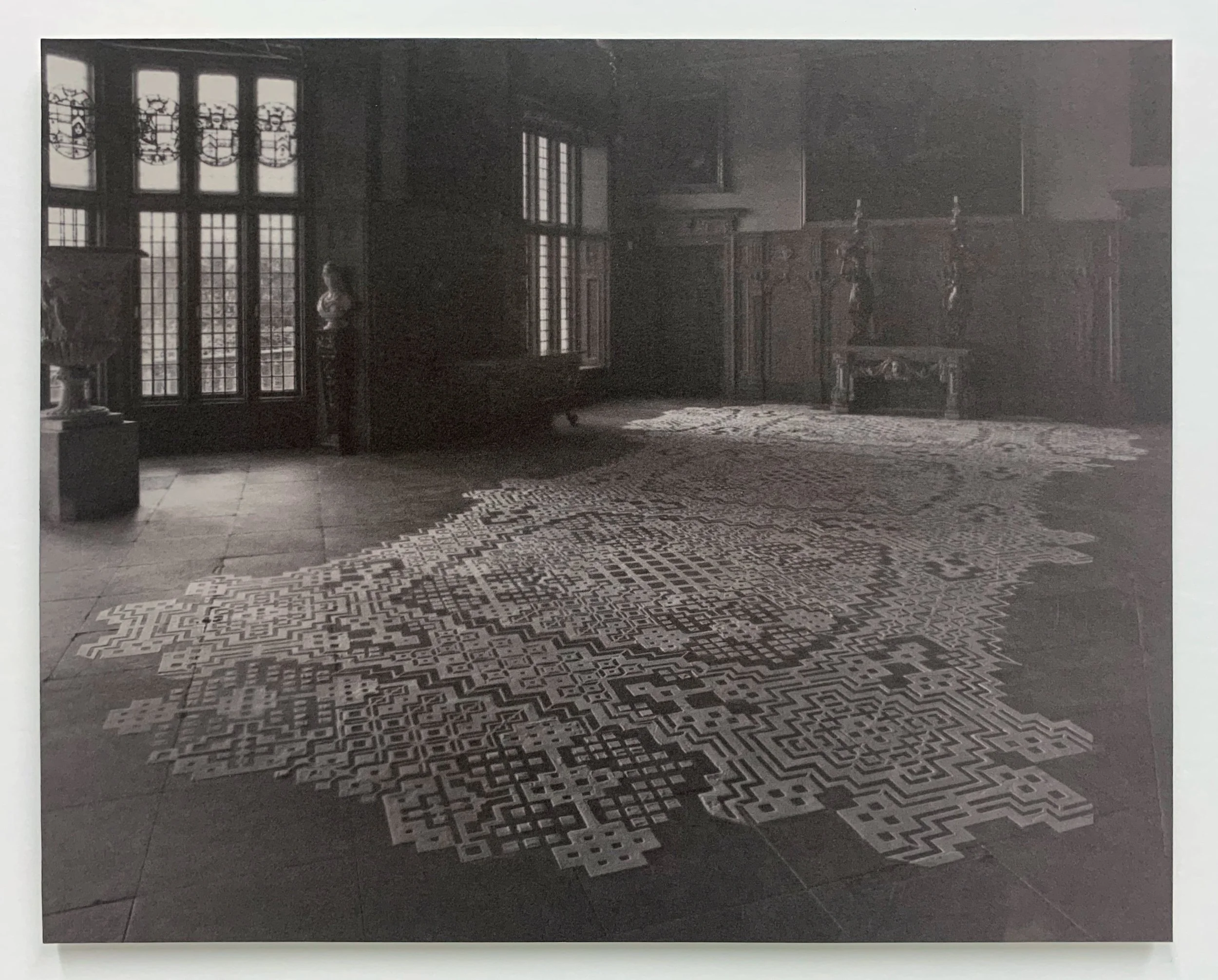 After I had my first child, I was trying to explore ways of working, when travelling and taking on large-scale commissions became difficult for a while. I began using archival images of empty interiors, taken from a collection of photographs that captured buildings that no longer exist as the result of ruination, fire, demolition or extensive conversion, as proxies for real spaces. In the series Sad Bones (2013-18), I set the fireplaces of these images alight, momentarily animating them, and leaving behind traces of soot and ash clinging to the surface. In the work Filling Absense (2017), I used fire ash to create a wall drawing of the wallpaper seen in the backdrop of one of the photographs to scale, as a way of re-conjuring the space, using a residual domestic material. Wallpaper patterns have always been a motif in my work, there’s something about wallpaper being a witness to domestic life, and a way of locating a place in a particular time. In Filling Absense, the drawing is left incomplete, a monochrome shadow of the space it is depicting, and a subtle reminder of how it felt to stand within it. In retrospect this idea of being a shadow, being only half there, seems very reflective of my own feelings at the time. A parent of two young children, I was feeling increasingly invisible and overlooked as I struggled to make work and make a living, I did feel like I was disappearing. Which, while I probably didn’t really speak about it at the time, looking back feels very close to the surface of it all.