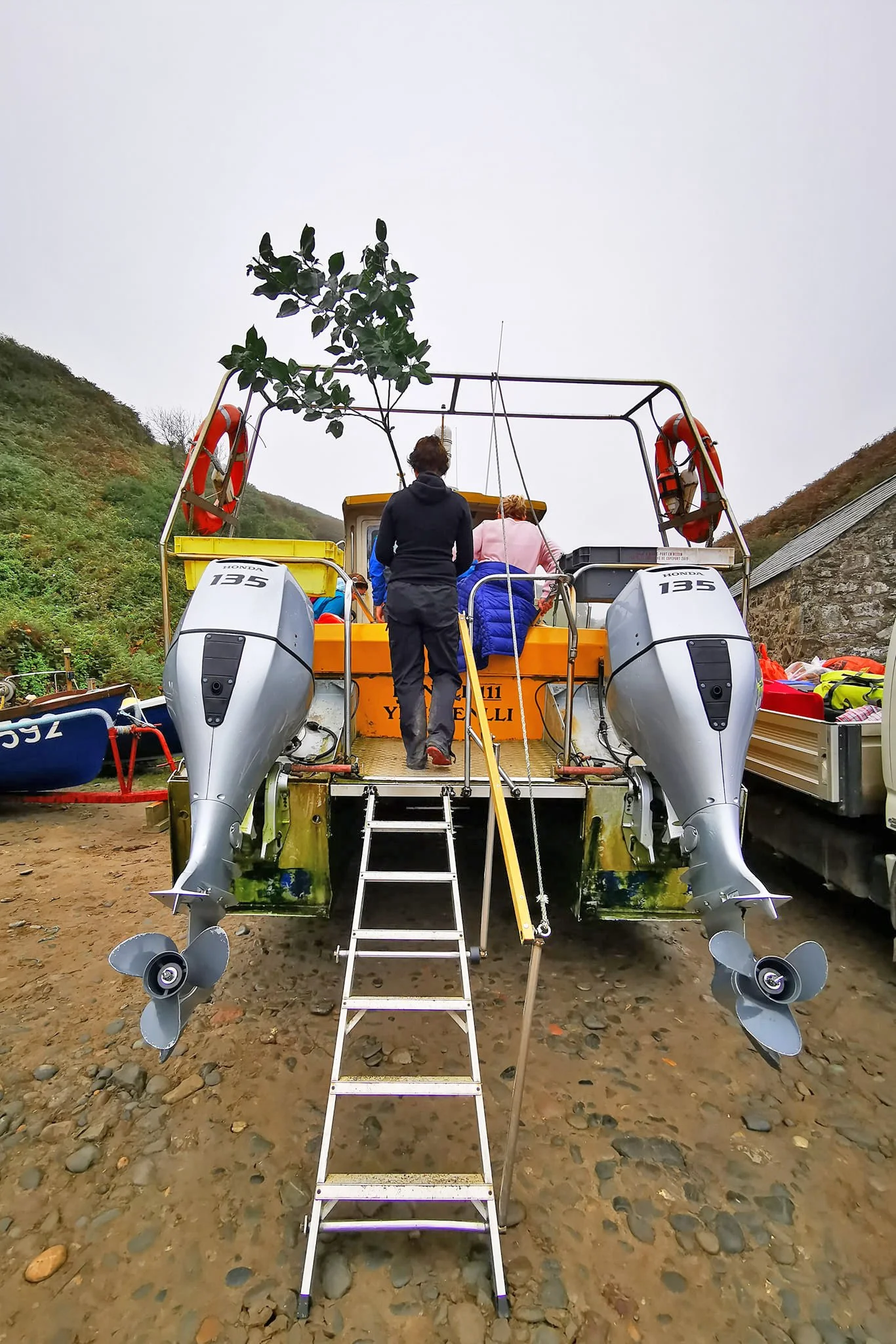 Crossed Paths – Bardsey Apple Tree, performance, Bangor to Bardsey Island, 2022. Photo: Ashley Calvert