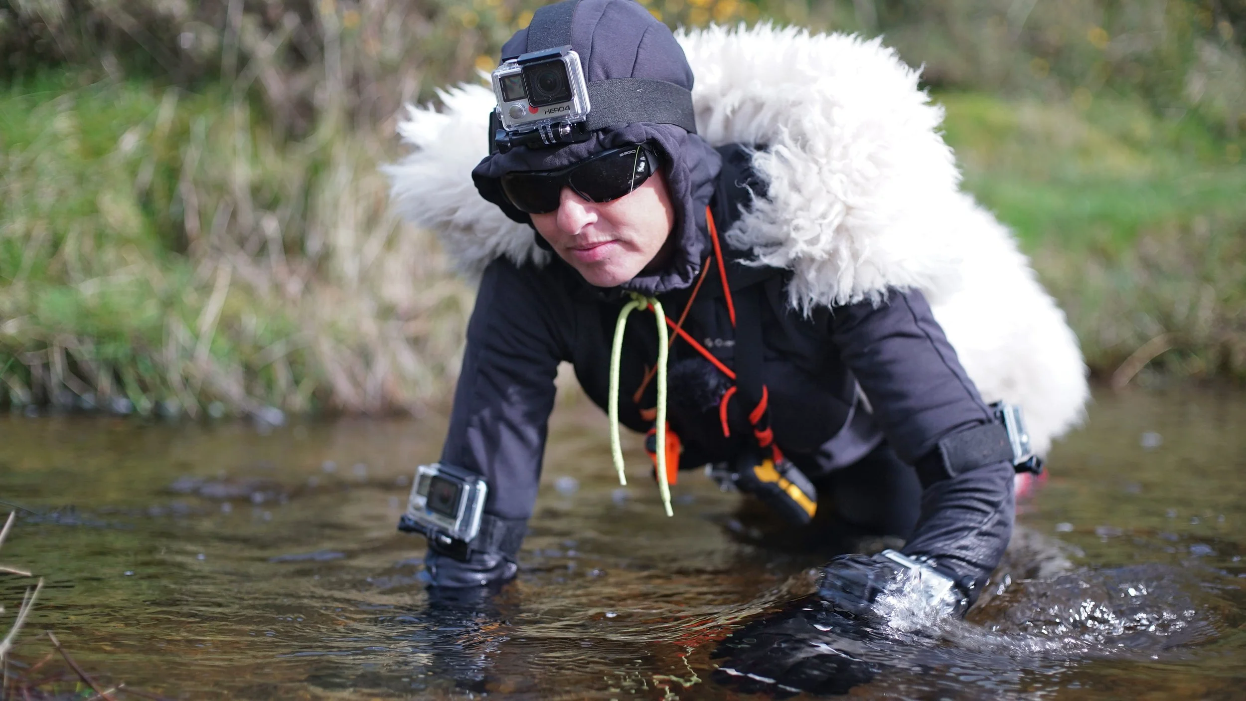 In the period of experimentation referenced above I began using GoPro cameras, first attached to my ankles as I walked the rocky mountain paths in just socks, then attached to trees so that the trees could see and be seen from multiple perspectives. I attached GoPros to my dinghy as it drifted on the pools in the wind, I attached them under and above the cattle grid and then to my body as I crawled, eventually I was wearing 15 cameras on my limbs, stomach, head, bum, mouth and back. The camera covered body, when crawling, fascinated me – I loved getting home to trawl through the thousands of minutes of seemingly unremarkable footage that revealed a landscape that I had not seen as fully or at all with my eyes. I realised that my body eyes could see in a totally new way, from a multiperspective – multiple coexisting point of view. It fascinated me that they saw my body in relation to itself and the cameras and the landscape simultaneously. I was dispersed, de-centred and dis-embodied, in it and part of it, all. I realised I was exploring material entanglement “in which various and variable materialities collide, congeal, morph, evolve and disintegrate” to quote Michel Serres in his book The Birth of Physics. The cameras and the clothing that I wear; red trainers, sunglasses, black Lycra, gloves, knee pads, etc, have become a kind of alter ego, or a familiar characterisation.