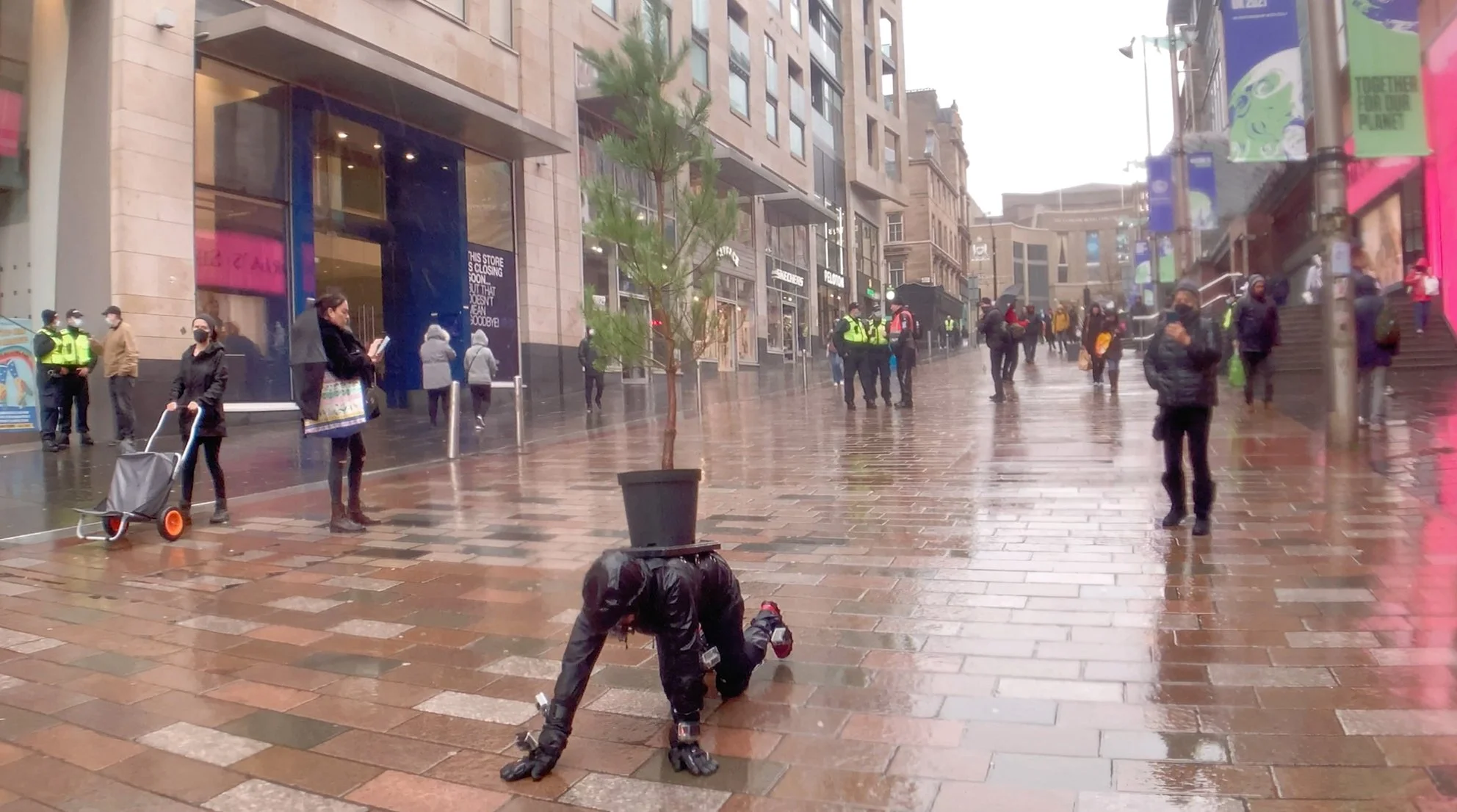 Crossed Paths – Scots Pine, film still, performance for COP26, Glasgow, 2021, Photo: Tim Sandys