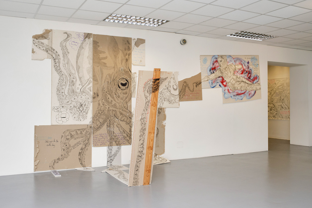 Stuart Mel Wilson, Creation of Mesonychoteuthis hamiltoni (detail), 2018, ink, chalk, marker on plasterboard, dimensions variable. Photo: Judith Fieldhouse