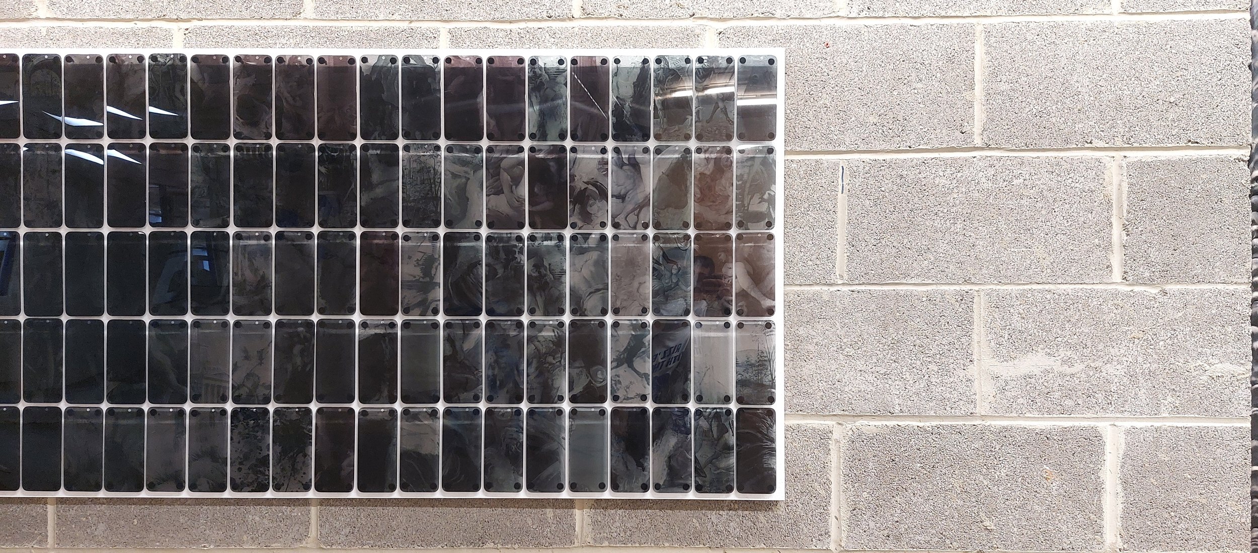 Carl Truscott, Pitter Patter (detail), 2025, tempered glass on wood, 61x366cm