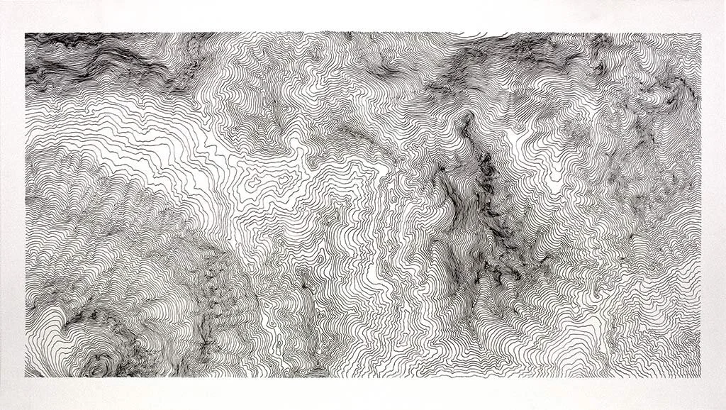 The Untitled (1:25000) ANW series of drawings (1999) use the convention of the contour line from map-making to create an imaginary landscape. Drawn by hand these landscapes develop organically continuing from one sheet in the series to the next. The drawings mimic the techniques of the map, our traditional means of navigation and orientation, yet their form is used to negate the very purpose of the medium.