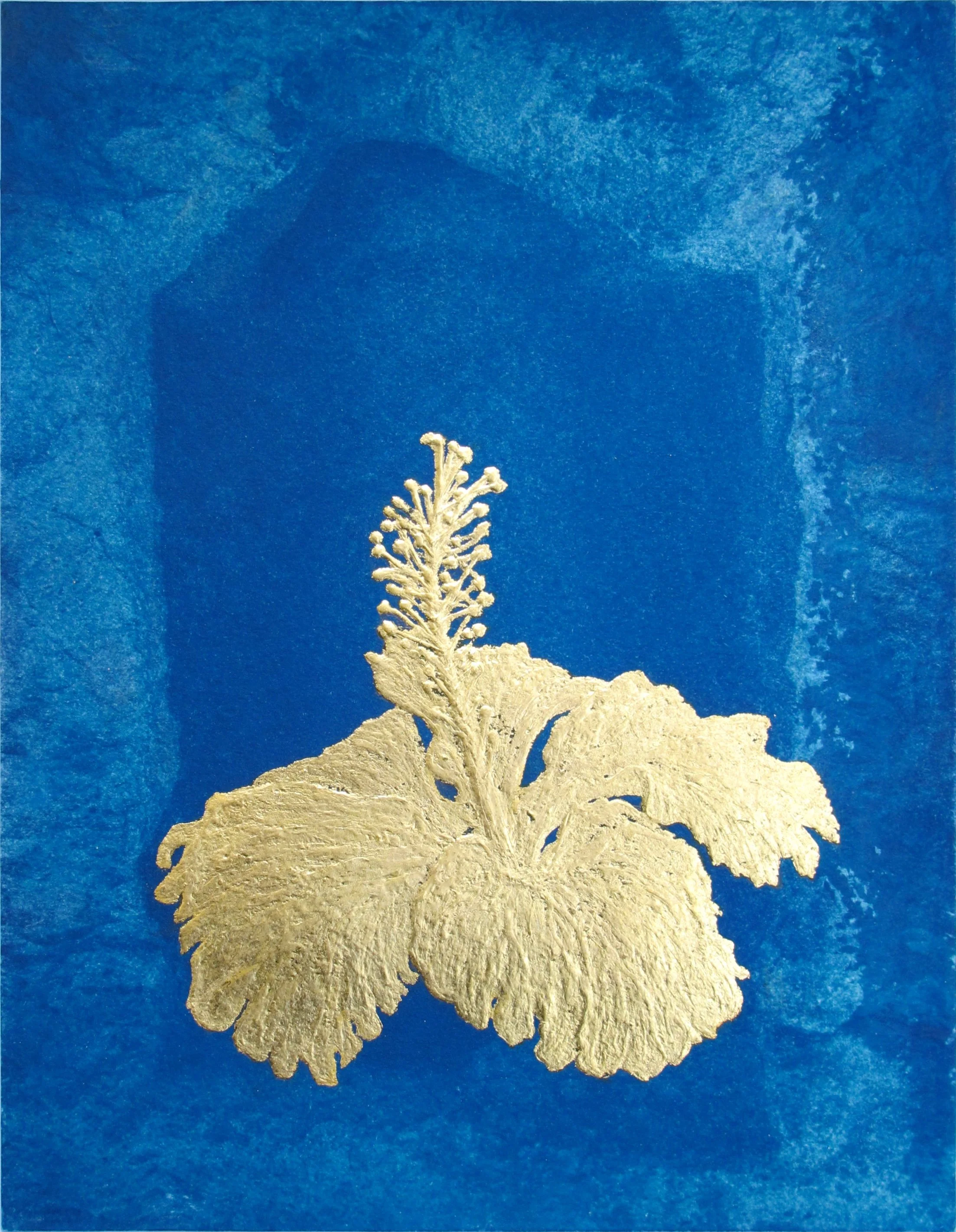 Nick Fox, Inferno V (study for hibiscus), 2025, cyanotype, coloured pencil, water-based size and 23.5 carat gold leaf on heritage rag paper, 23x17.8cm