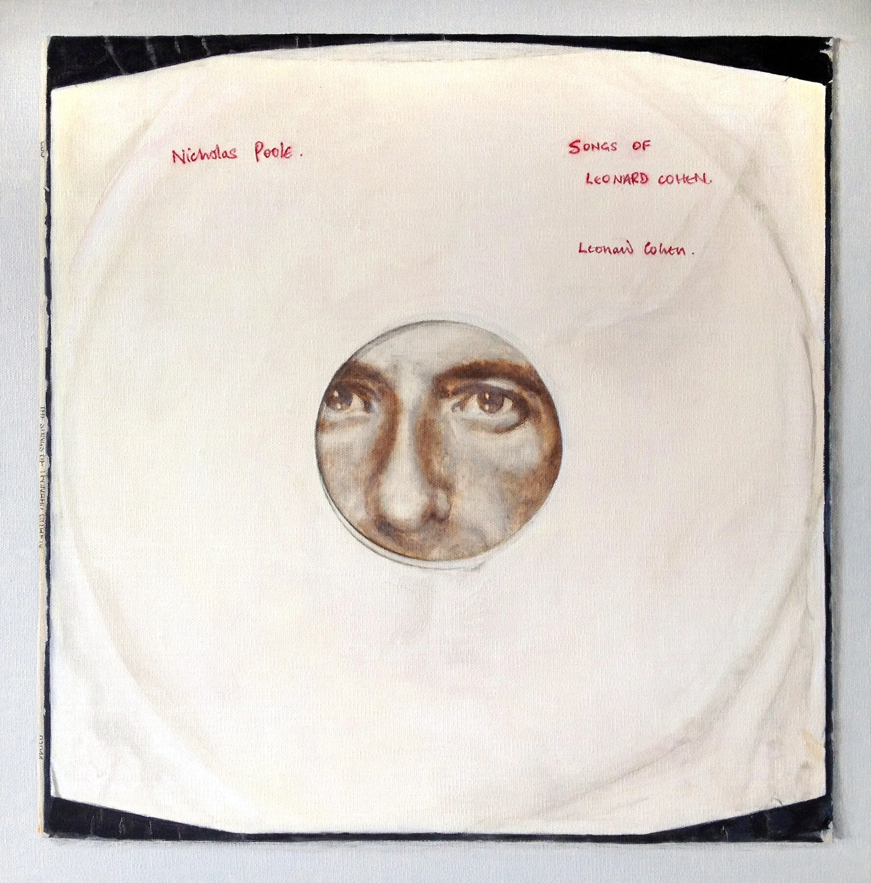 Earlier paintings feature second-hand copies of albums by iconic male singers. Palmer partially obscures the original cover artwork by placing the record’s inner sleeve over it so that little more than the face of the recording artist is visible. By highlighting the inner sleeves with their additions of personalised messages and texts, hand written by their one-time owners, Palmer creates a conversation between our idea of that artist and their work (whether it’s David Bowie, Leonard Cohen, or Frank Sinatra) and the ‘unknown’ person who once eagerly scrawled or carefully printed their thoughts thereon. Another series of drawings transcribes newspapers clippings, each rendered in painstaking detail, a process that confers value to events that may otherwise appear of little importance. In these earlier works, though the selection of stories seems random, the topics – such as ufology, war or obituaries – all attract an obsessive following.