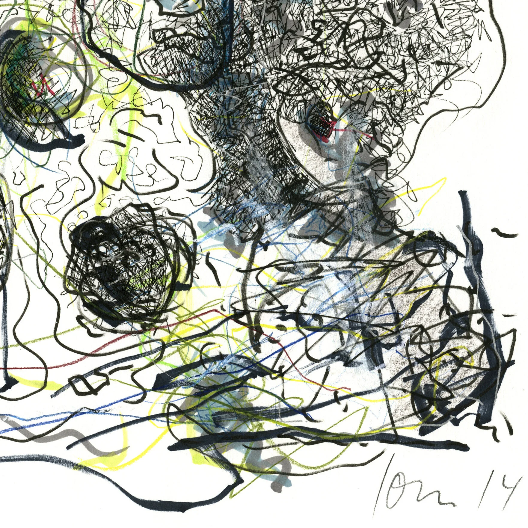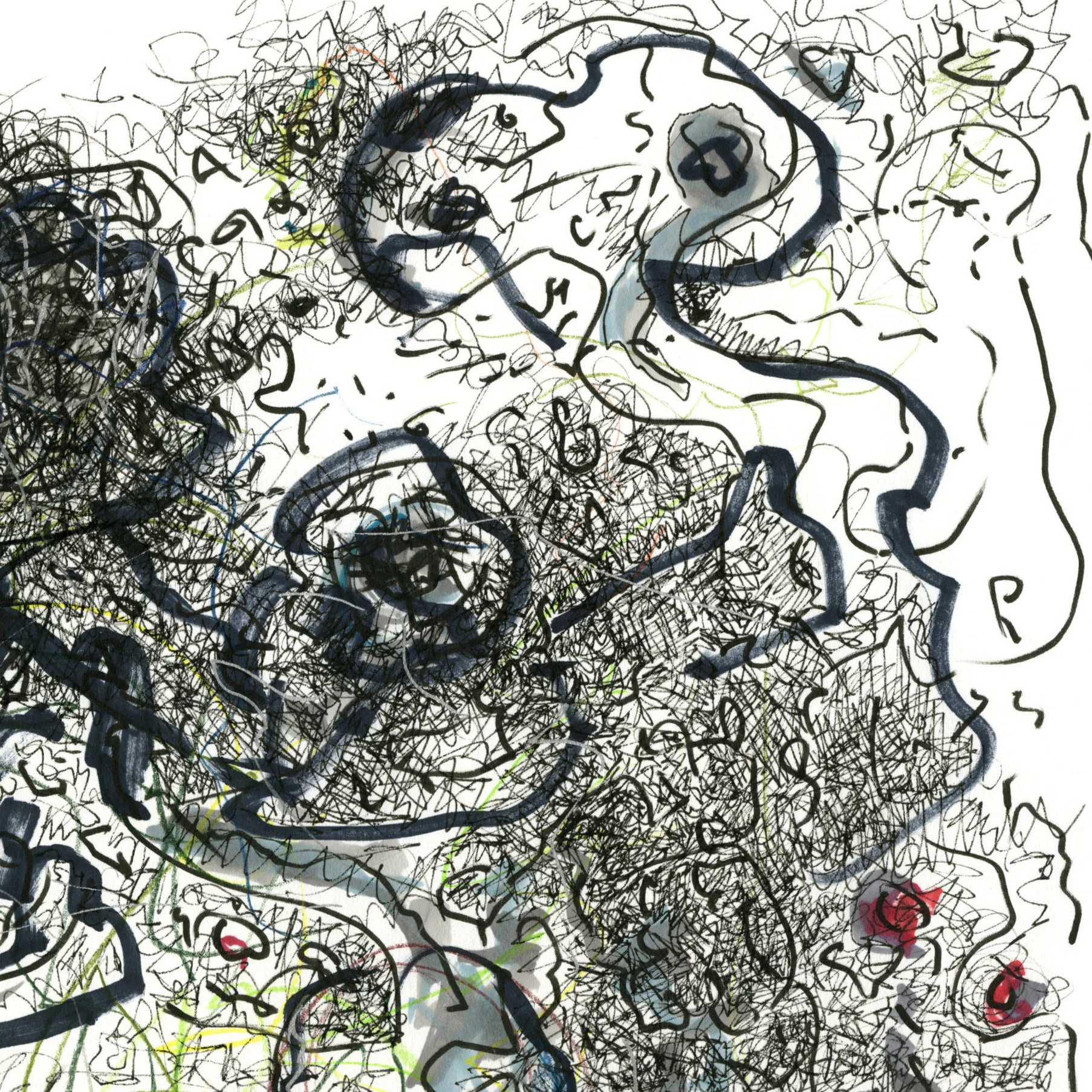 pencil, ink pen, colour pen, charcoal on paper